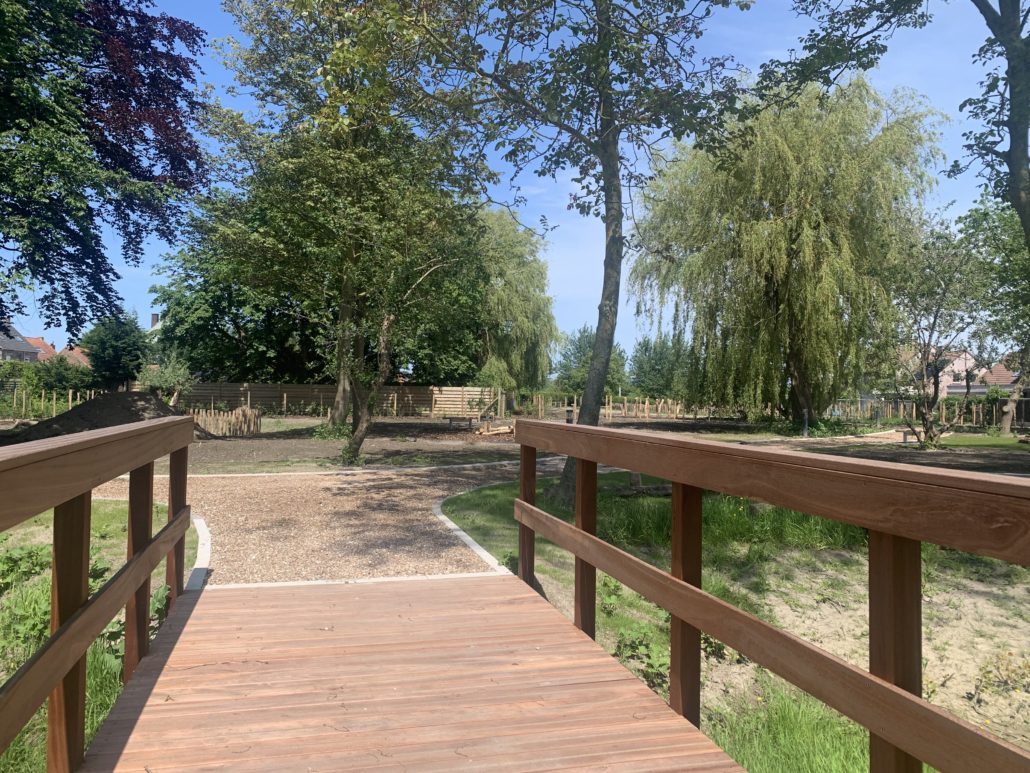 Nieuwe bomen werden geplant en bestaande exemplaren zorgvuldig verplaatst. Dankzij de aanleg van wadi’s, een fijnmazig rioleringsstelsel en zachte wandelpaden in halfverharding krijgt water de ruimte. Straatmeubilair, speeltoestellen en een nieuwe fietsbrug maken de omgeving compleet en uitnodigend voor iedereen.
