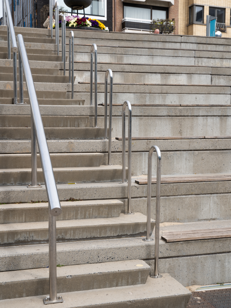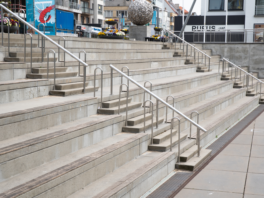 Bestaande verhardingen verwijderen en vervangen door bevloering en trappen uit betontegels. Aanplanten houtachtige gewassen. Plaatsen zitbanken, plantbakken
